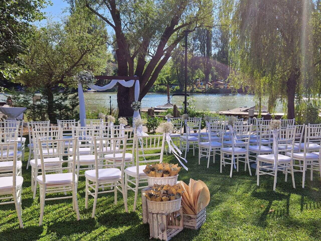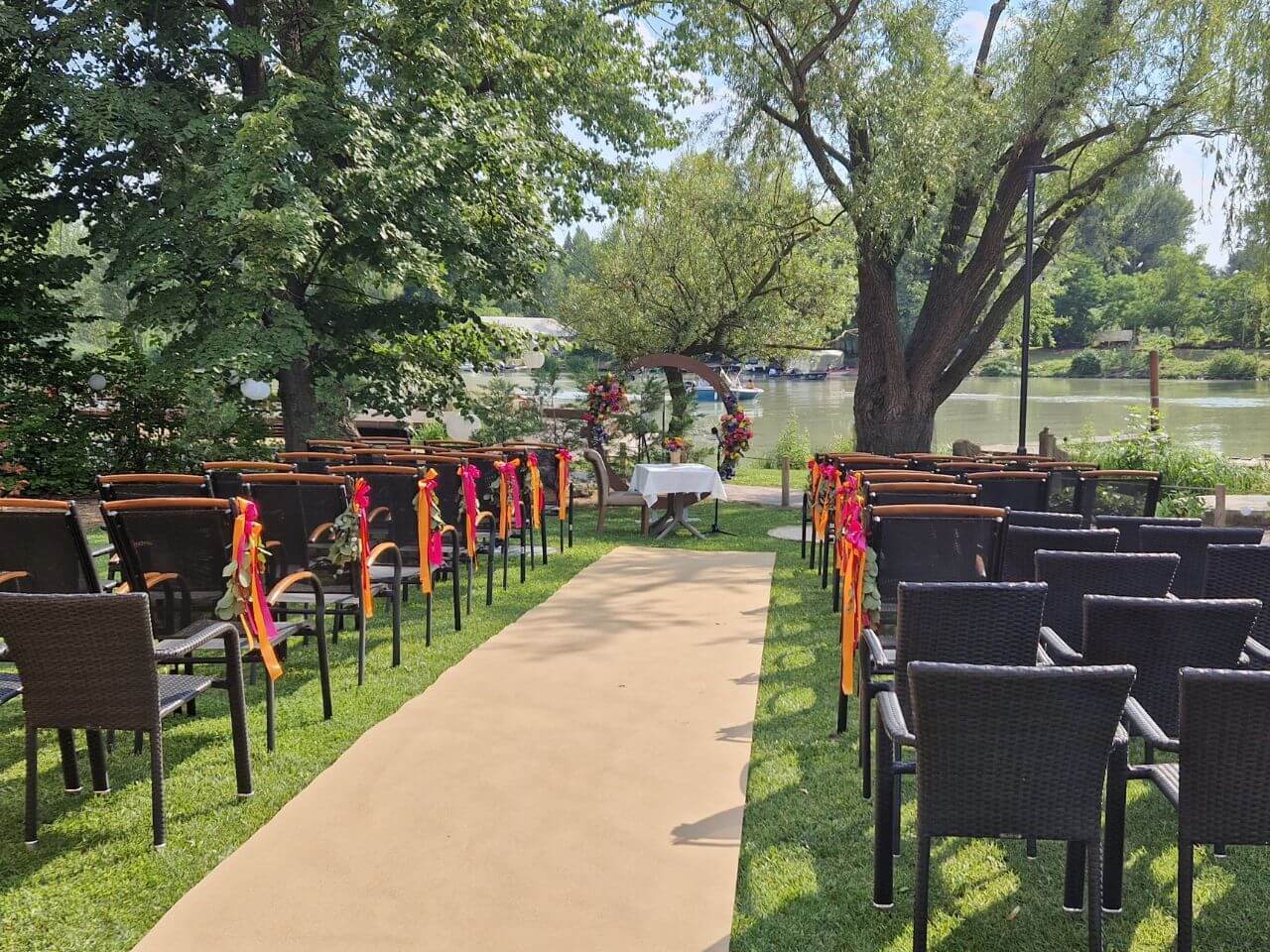 Csodaszép parkosított kertünk helyszíni esketések felülmúlhatatlan színtere, ahova a menyasszony és a vőlegény stílusosan, kikötőnknek köszönhetően akár hajóval is megérkezhet.