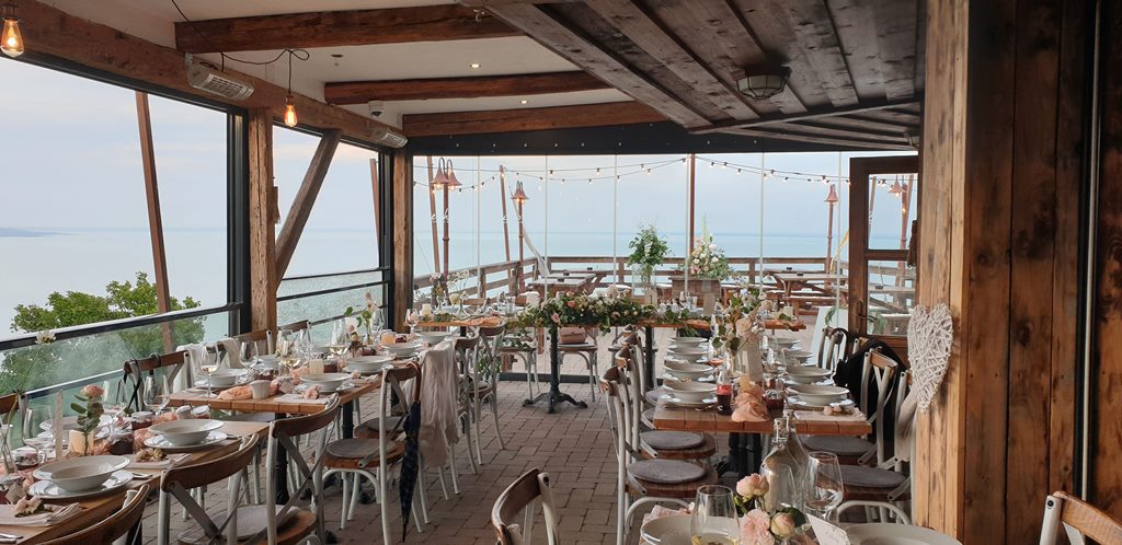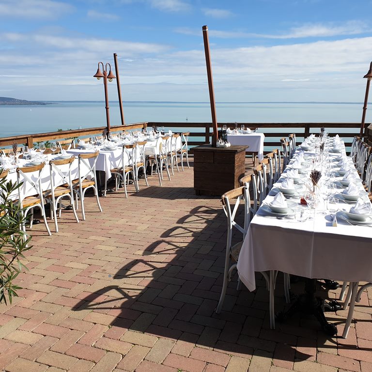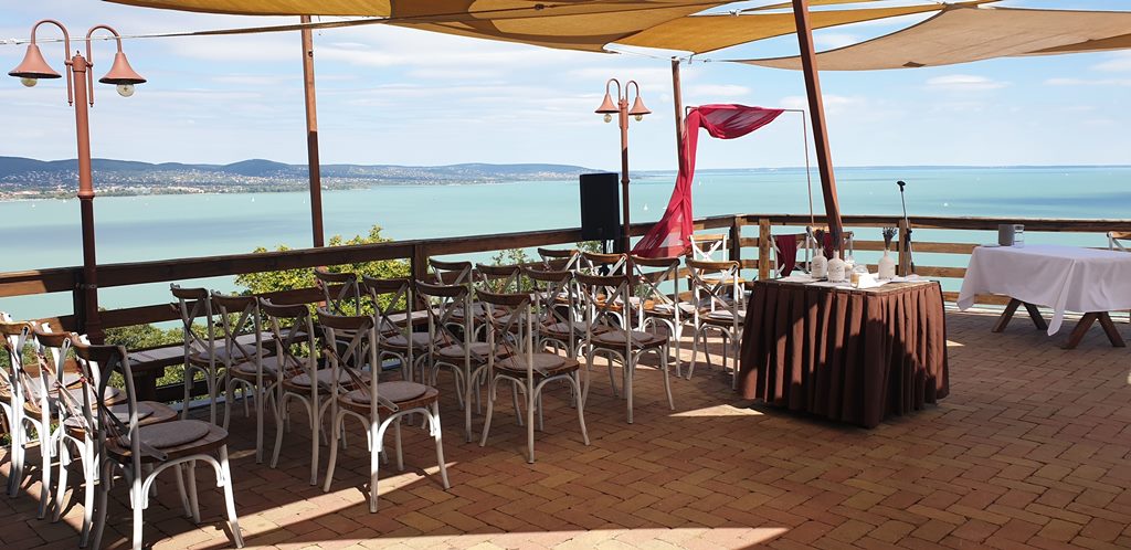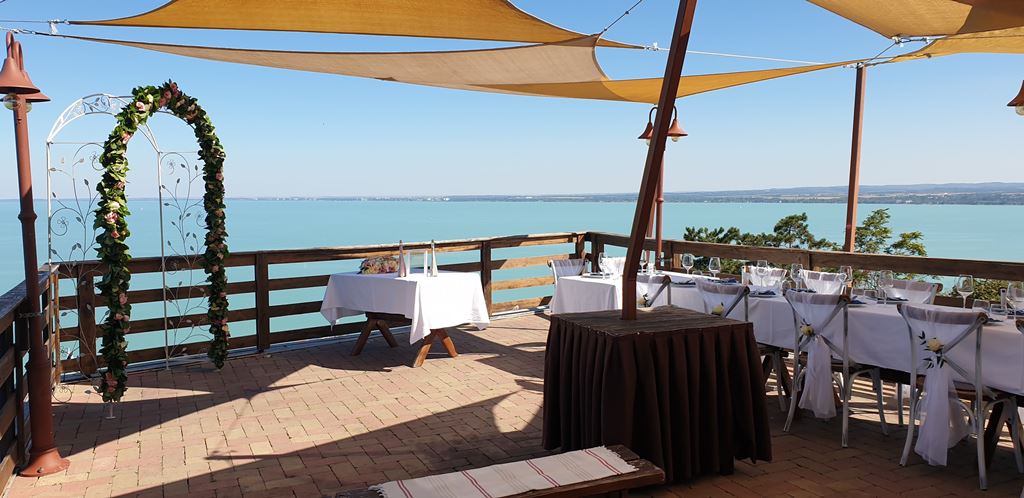 Nyitott Panoráma teraszuk a balatoni látogatásnak egyik kihagyhatatlan pontja és a polgári szertartás tökéletes helyszíne. Az árnyékolás napvitorlákkal biztosított, így a legnagyobb melegben is kiválóan alkalmas akár 100 fős állófogadás, esküvői ceremónia, vagy egy kisebb esküvői ebéd lebonyolítására.