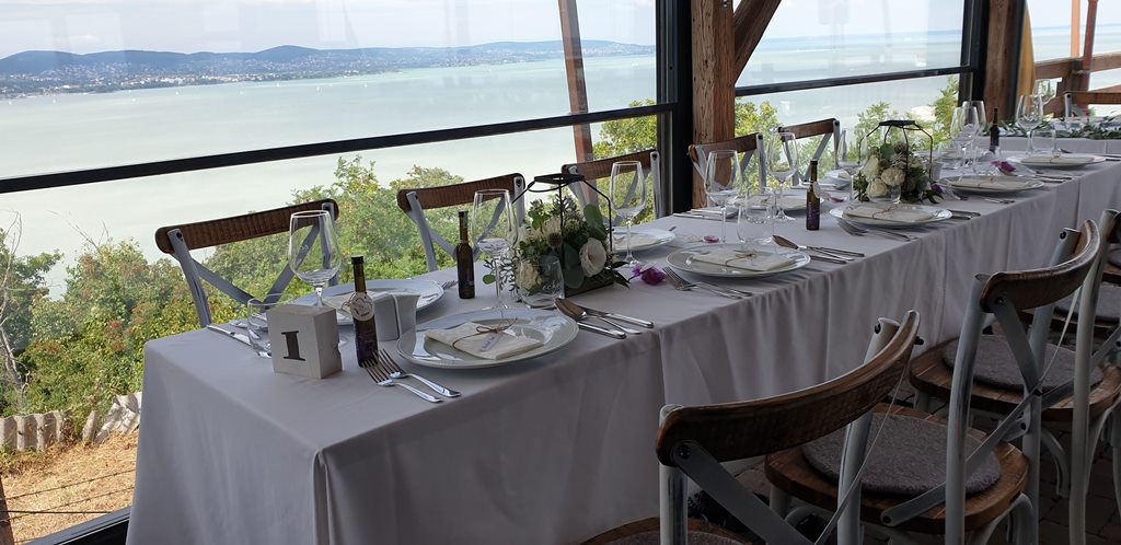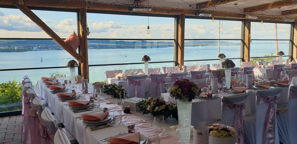 Fedett Panoráma teraszuk az esküvői vacsora felejthetetlen helyszíne, melynek alap dekorációját a Balaton keleti medencéjére néző üvegfala biztosítja. Ezt kiegészítve, rusztikus bútorzata és antik gerendái adják az igazi romantikus, meghitt hangulatot. A nyitható üvegfelületeknek köszönhetően meleg időben kellemesen átjárja a levegő, így néhány pillanat alatt szabadtéri vacsora illúzióját kelthetjük, de a hűvősebb hónapokban is megfelelő hőmérséklet mellett élvezhetjük a varázslatos panorámát. A bútorzat könnyen mozdítható, így az ültetés, illetve elrendezés rugalmasan variálható.