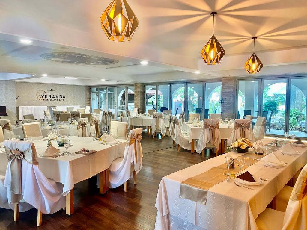 Természetes fénnyel, nagy ablakokkal, közvetlen teraszkapcsolattal és kiváló felszereltséggel rendelkező esküvőhelyszínünkön saját bárpult található, amely kérés esetén akár el is távolítható a vendégsereg függvényében. Esküvőhelyszínünk kis és nagy létszámú menyegzők számára is ideális. Négycsillagos wellness hotelünk 76 fő kényelmes elszállásolására alkamas, ennél nagyobb eseményekhez a hotel közelében fekvő, könnyedén elérhető szállást biztosítunk.