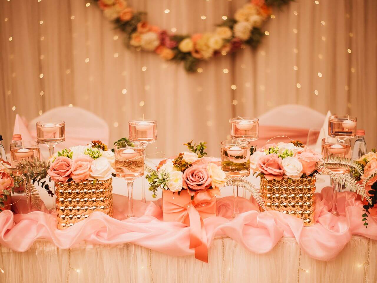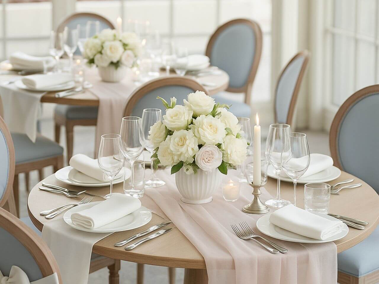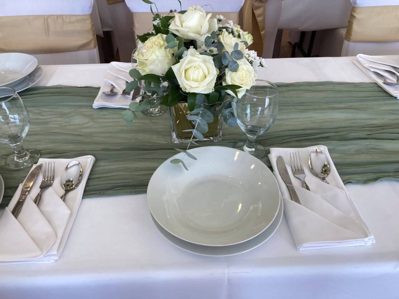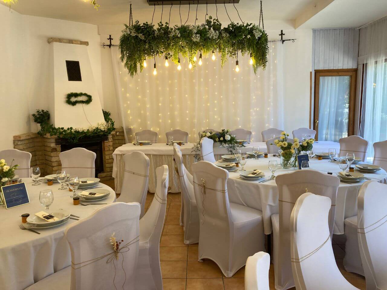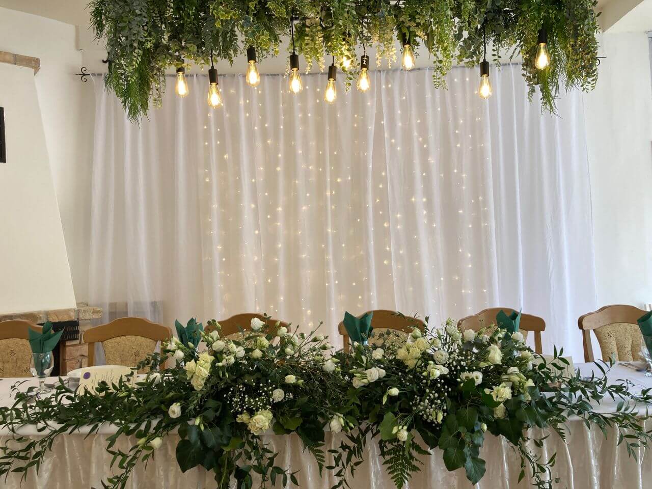 Minimális feladatot jelent a terem dekorálása, mert a trendi, greenery stílusú dekoráció önmagában is elegendő díszítést nyújt. Mindössze kisebb asztaldíszítésre van szükség, például virágok elhelyezésére az asztalokon, köszönetajándékok kitételére és az ültetési rend kialakítására.