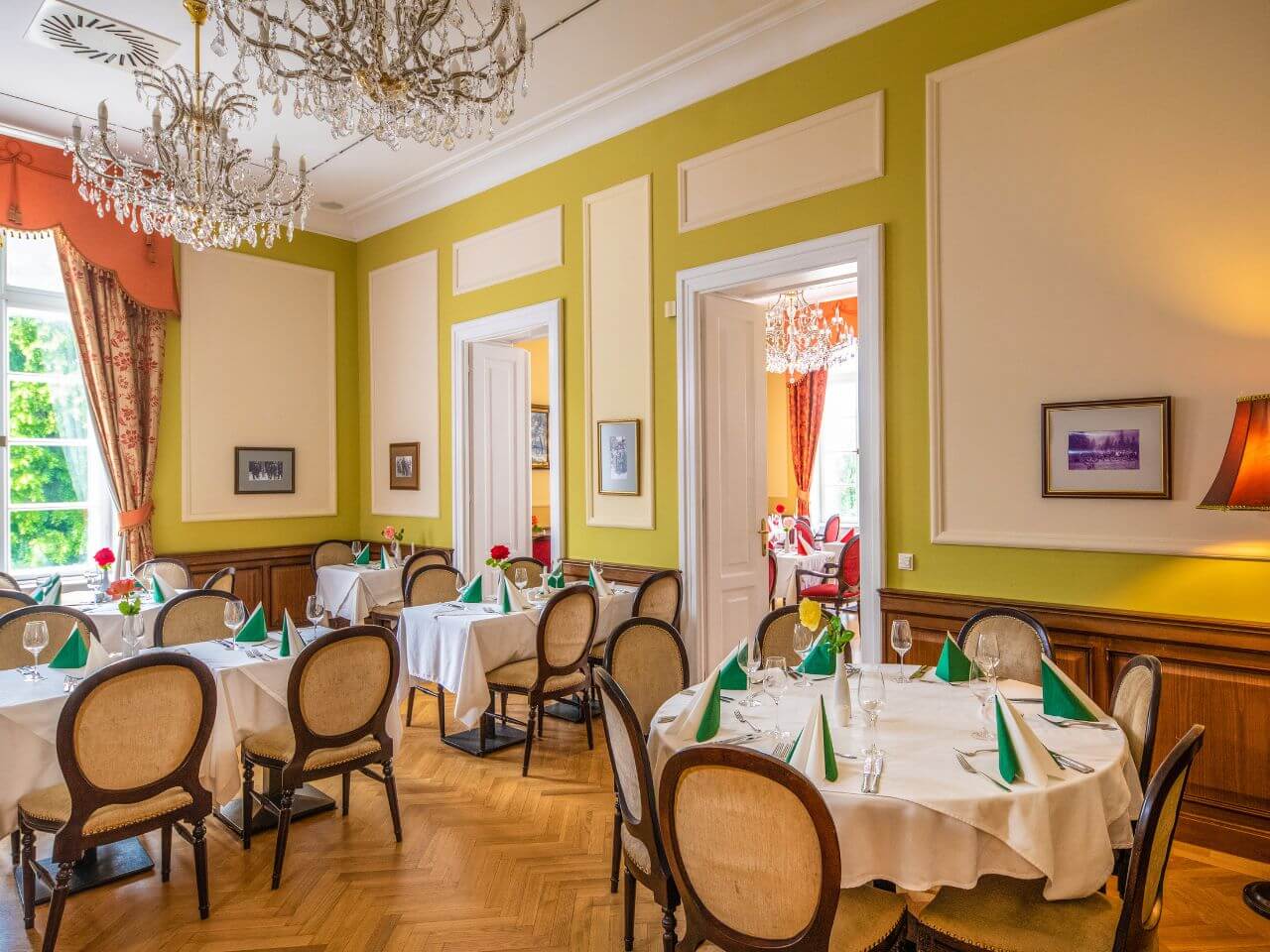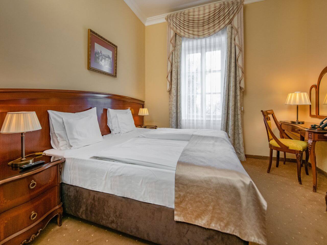 A Kastély 45 db patinás kétágyas szobával rendelkezik 3 szinten, 4 féle szobakategóriában. A többi 35 db exkluzív kétágyas szoba, egy különálló épületben az Udvarházban található további 4 szinten. A szobák elegáns olasz bútorai, a nemes anyagú függönyök a közvetlen szobai szaunázási lehetőség luxusélményt biztosítanak.