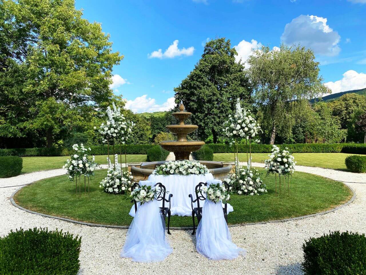 Jó idő esetén a ceremónia meghitt pillanataihoz kiváló helyszín a Kastély gondosan ápolt franciakertje hangulatos szökőkúttal vagy a direkt erre a célra kialakított Rózsakertünk és Grillteraszunk. A terasz gyönyörű, erdei panorámával csábít. A lélegzetelállító kilátás mellett a luxus kényelmet napernyők, kerti bútorok és a megszokott, magas színvonalú kiegészítők biztosítják. A rózsaágyak és a fűszernövények pedig romantikus hangulatot kölcsönöznek a helynek 600 m2-en.