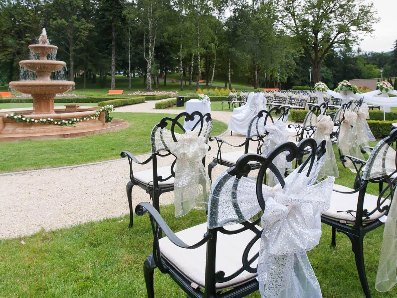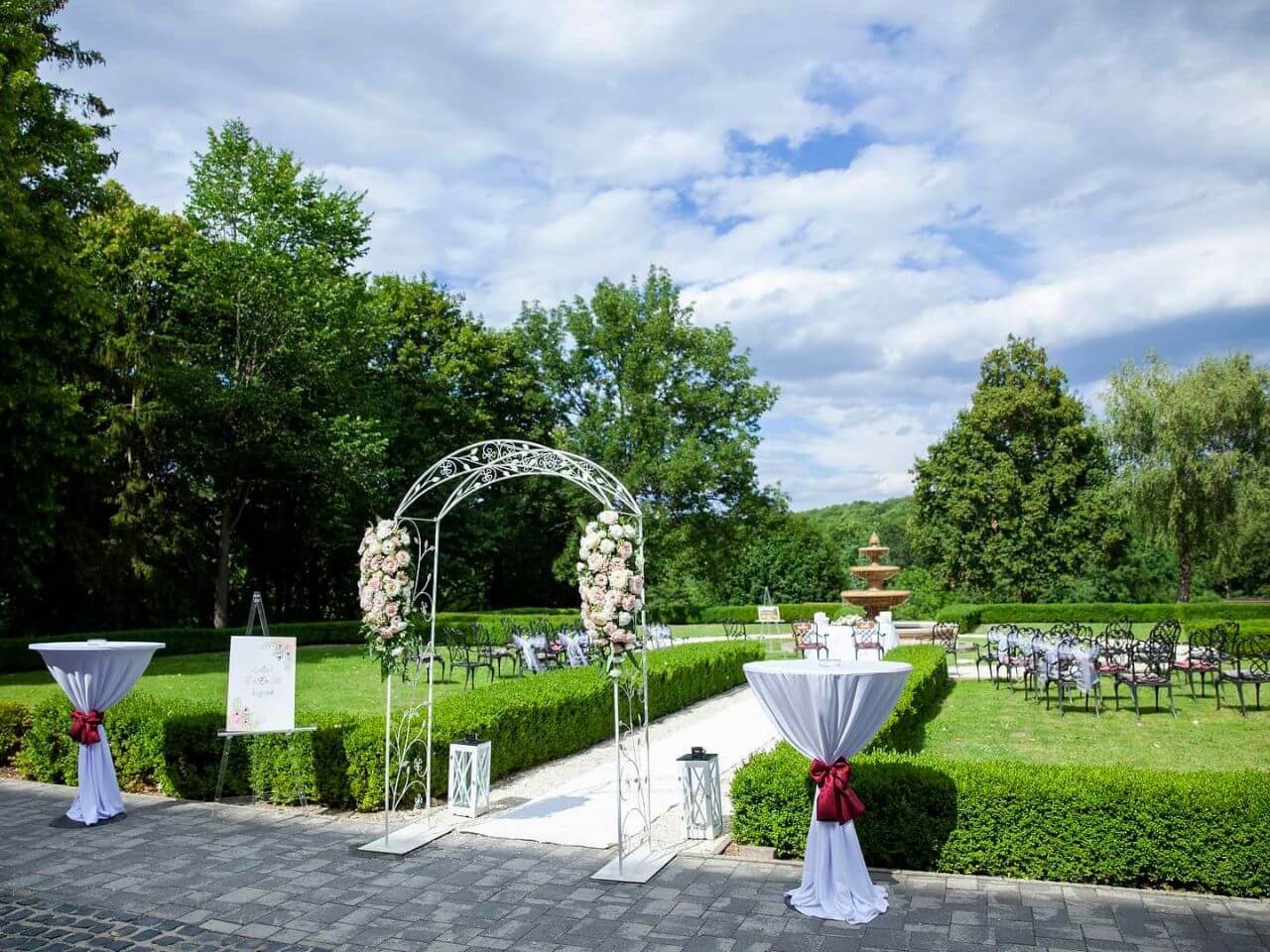 Jó idő esetén a ceremóniához kiváló helyszínt biztosít a Kastély gondosan ápolt francia kertje hangulatos szökőkúttal vagy a direkt erre a célra kialakított Rózsakertünk. Az állófogadás lebonyolítására a 150 fős panoráma Grillteraszunk is igényelhető.