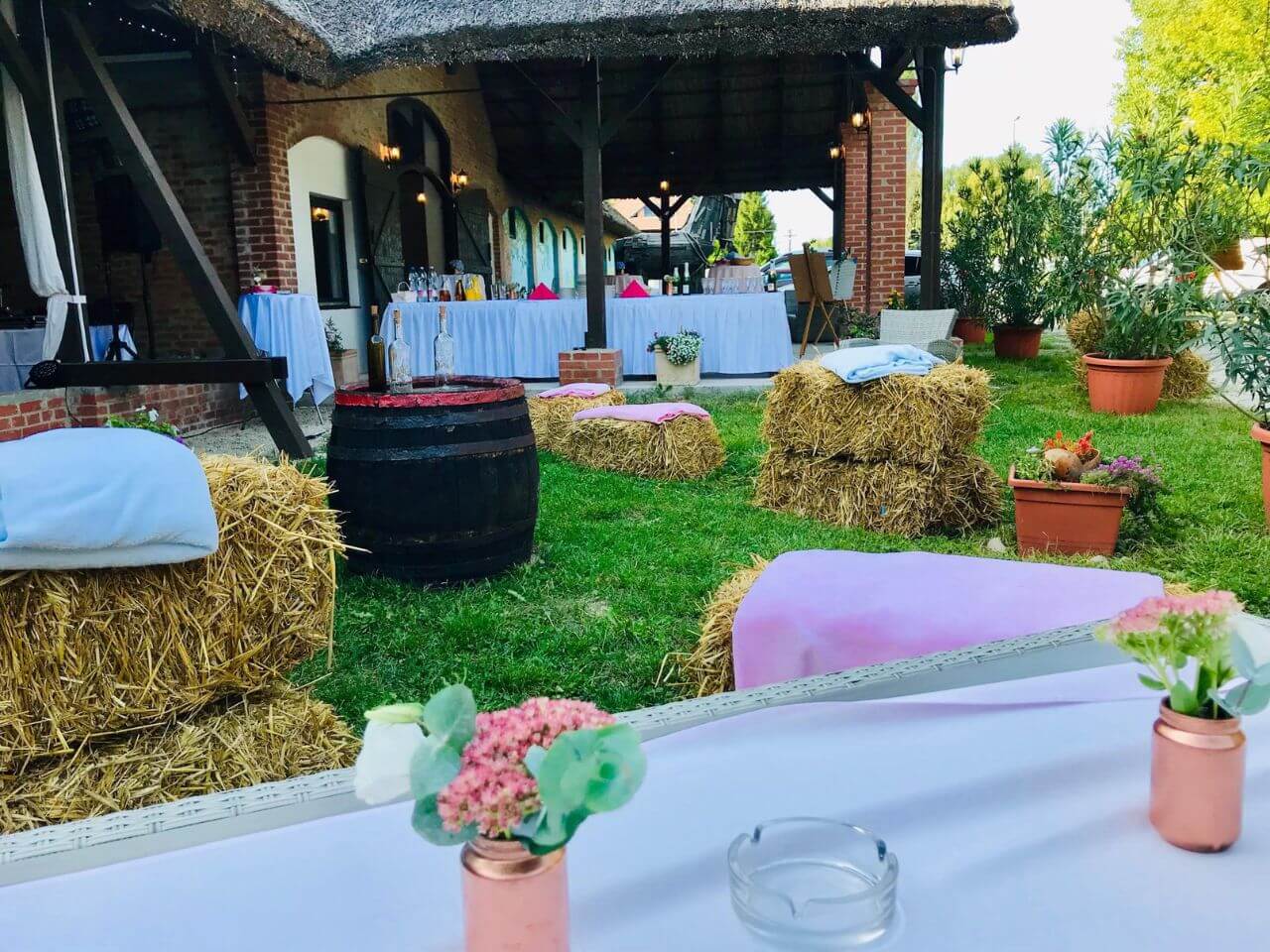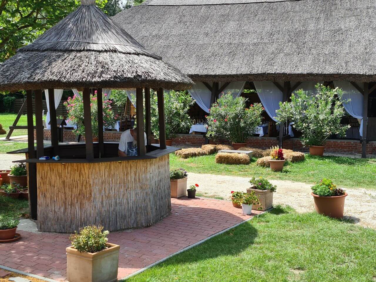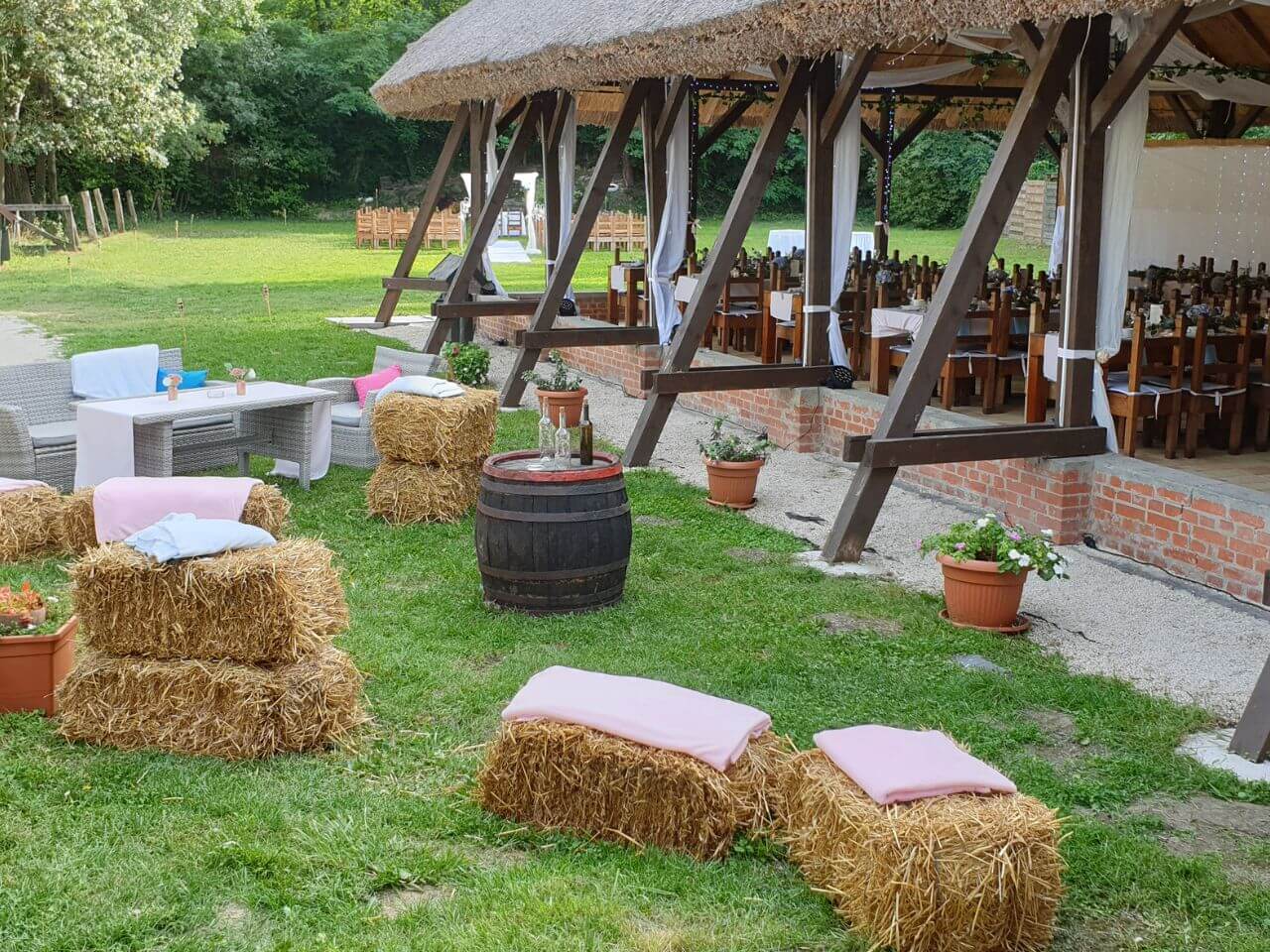 A Birtok ékköve a félig nyitott, nádtetős pajtánk, mely kiválóan alkalmas akár az egész lakodalom lebonyolítására. A szertartásokhoz a pajta melletti nagy rét kiválóan alkalmas: kétoldalt gyönyörű, színes virágágyással szegélyezett, a háttérben pedig zöld erdősávval, a rusztikus, nádtetős pajta mellett remek kontrasztot ad a hatalmas zöld réten a hófehér chiavari székekkel, dupla ajtós boldogságkapuval berendezett szertartás.