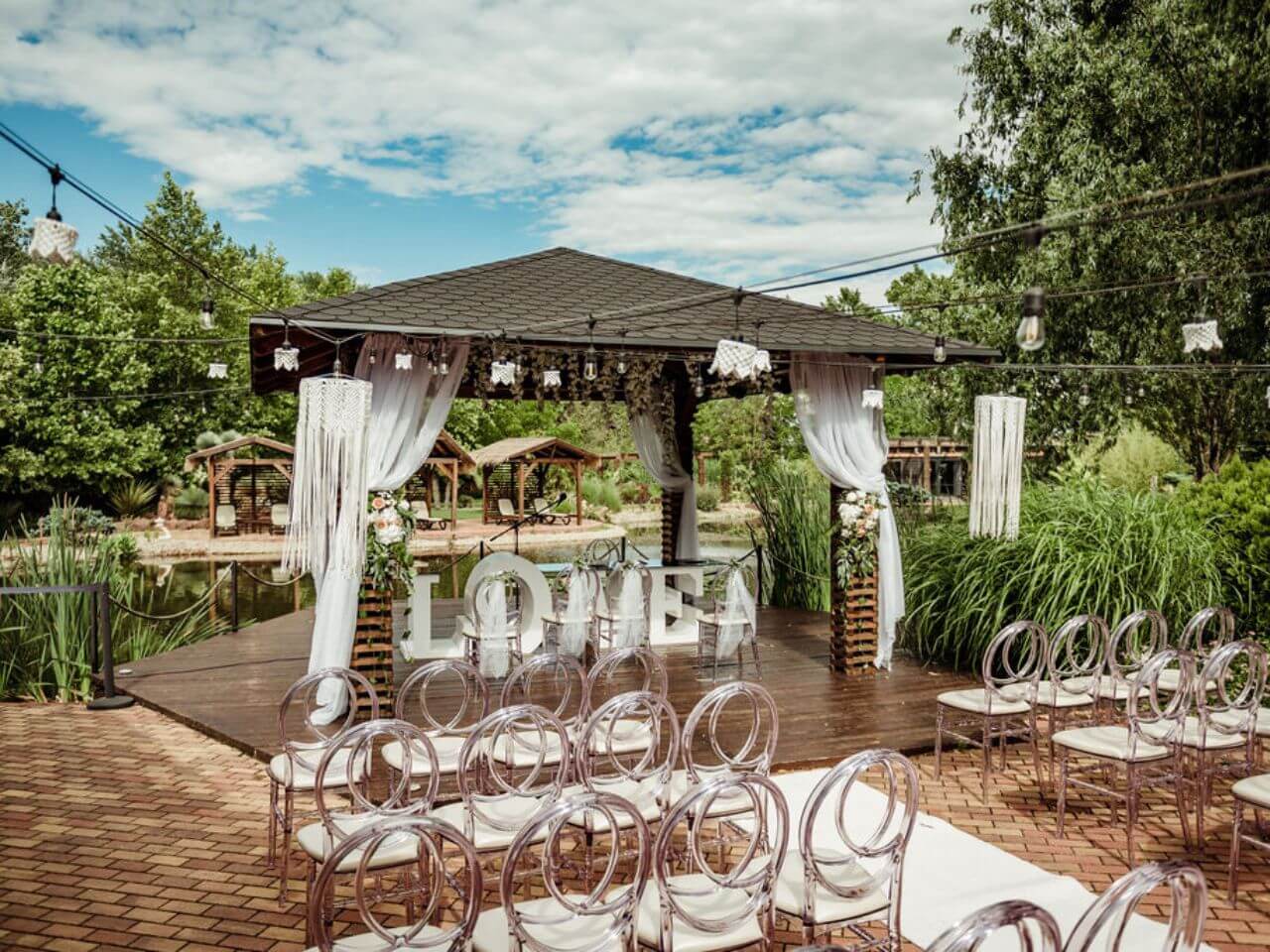 A tónál – a szigeten vagy a stégen – romantikus, vízparti környezetben történő szertartás külön egyeztetés alapján lehetséges, igényektől függően dekorálva. A szigeten max. 20-25 fő tud leülni a szertartáson, a többi vendéget a tóparton tudjuk elhelyezni.