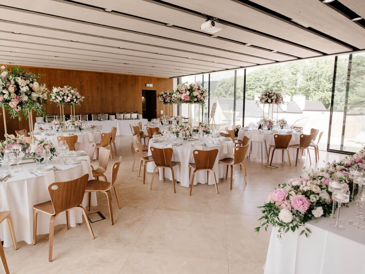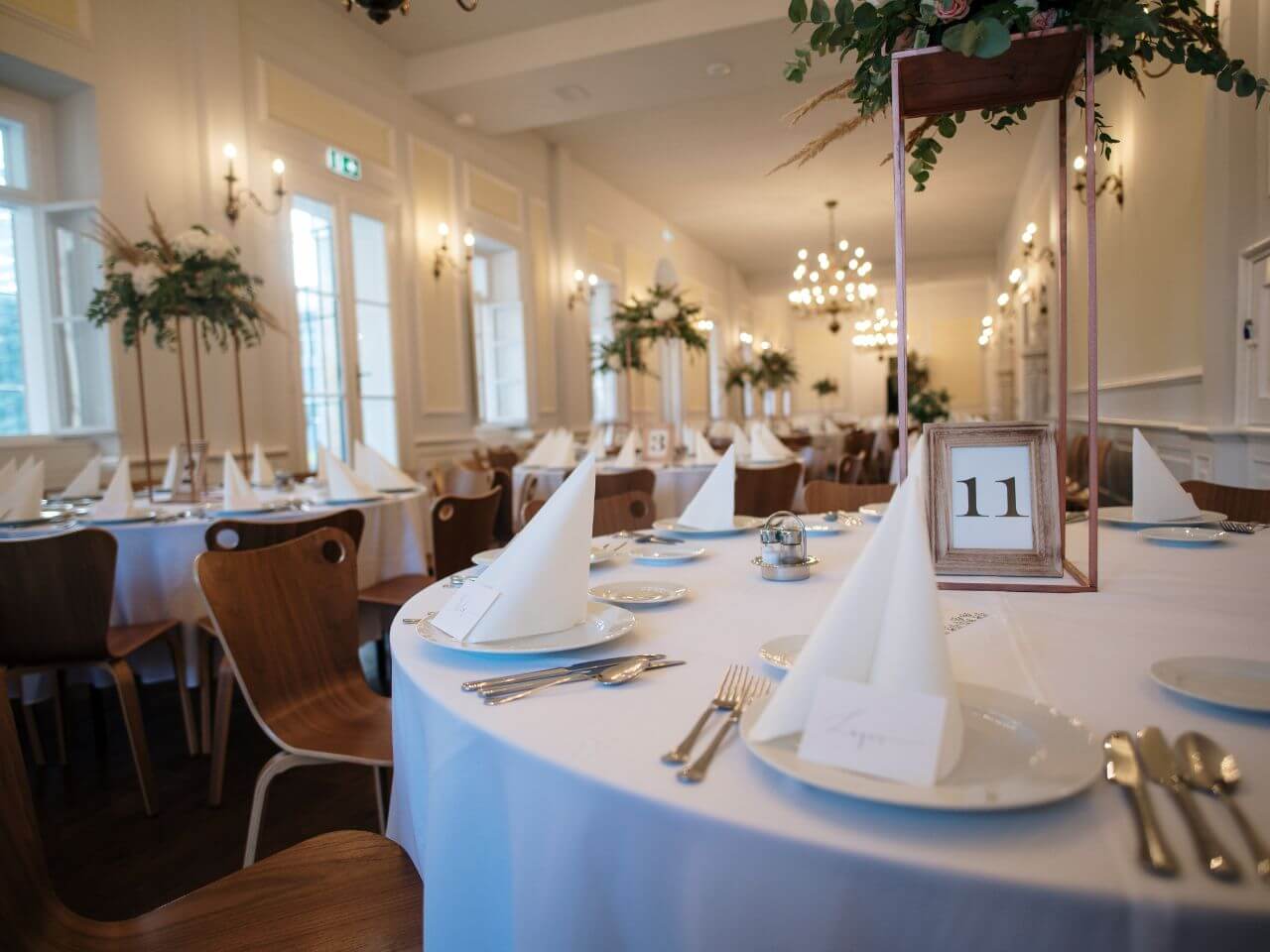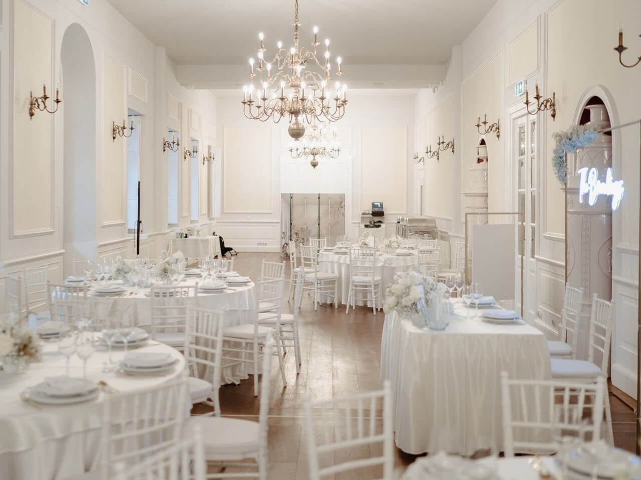 A Szent István terem bérleti díja a következőket tartalmazza: szolid, ízléses alapdíszítés, kellemes, meleg fényű fényfüzér a hátsó falon a főasztal mögött, fehér organzával borítva. A mennyezeten fehér dekorgömbök, fehér organza és meleg fényű fényfűzérek, táblaasztalok, kényelmes, kárpitozott székek, fehér abrosz, fehér textilhatású papírszalvéta, fehér étkészlet és talpas pohár.