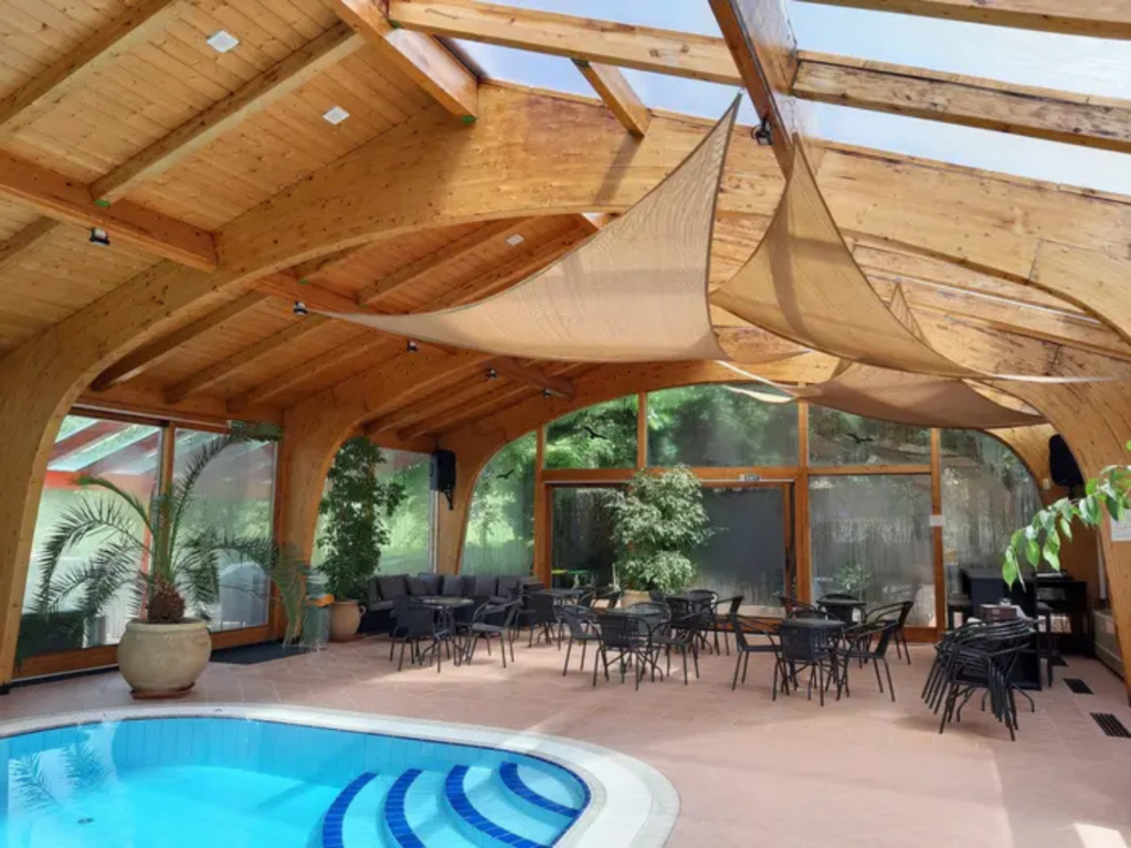 • Feszített víztükrű fűtött medence (150 cm mély, télen-nyáron 32-34 fokra fűtött)